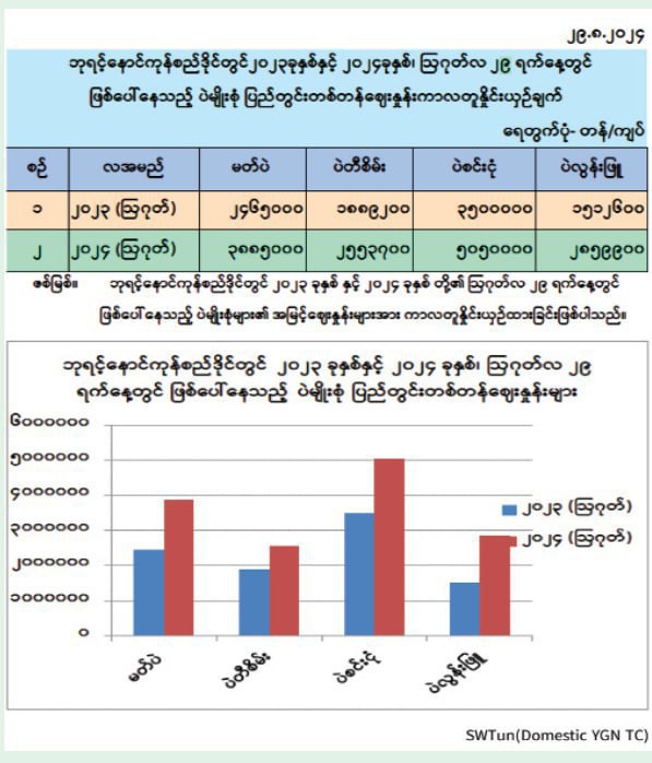 In the last month of August 2023, the main exports abroad were more than 24 and a half hundred thousand kyats per ton of mung beans, about 19 hundred thousand kyats per ton of green beans and 35 hundred thousand kyats per ton of Pigeon pea. Now, in August 2024, the price of mung beans has risen to over 39 lakhs kyats per ton, to over 25 lakhs kyats per ton of green beans, and to over 50 lakhs kyats per ton of Pigeon pea.