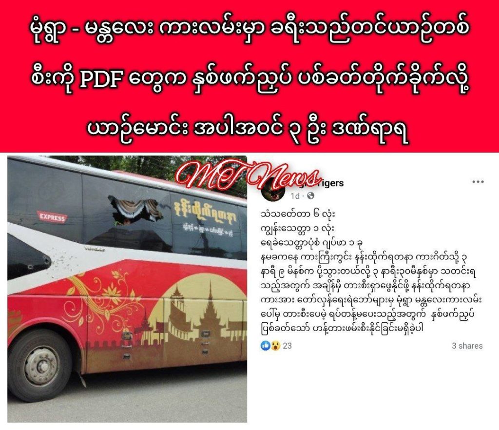 During this incident, the PDF who fired at NanHtike Yadana’s bus stopped it on the Monywa – Mandalay road, but it did not stop, even though they fired, a PDF that shot at NanHtike Yadana’s bus confessed on social networks.