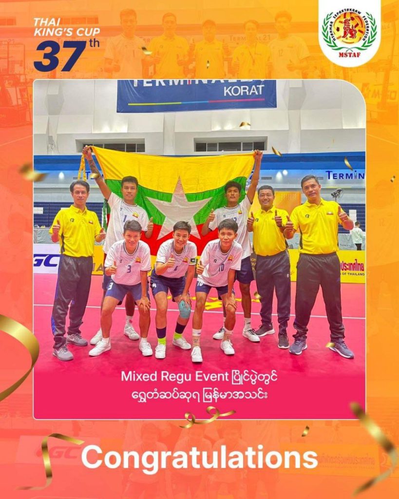 The Myanmar national team, competing in the King of Thailand Cup Sepak Takraw, secured the gold medal in the Mixed Regu Event (5 teams). In the round-robin format, the Myanmar team defeated all four rival teams.