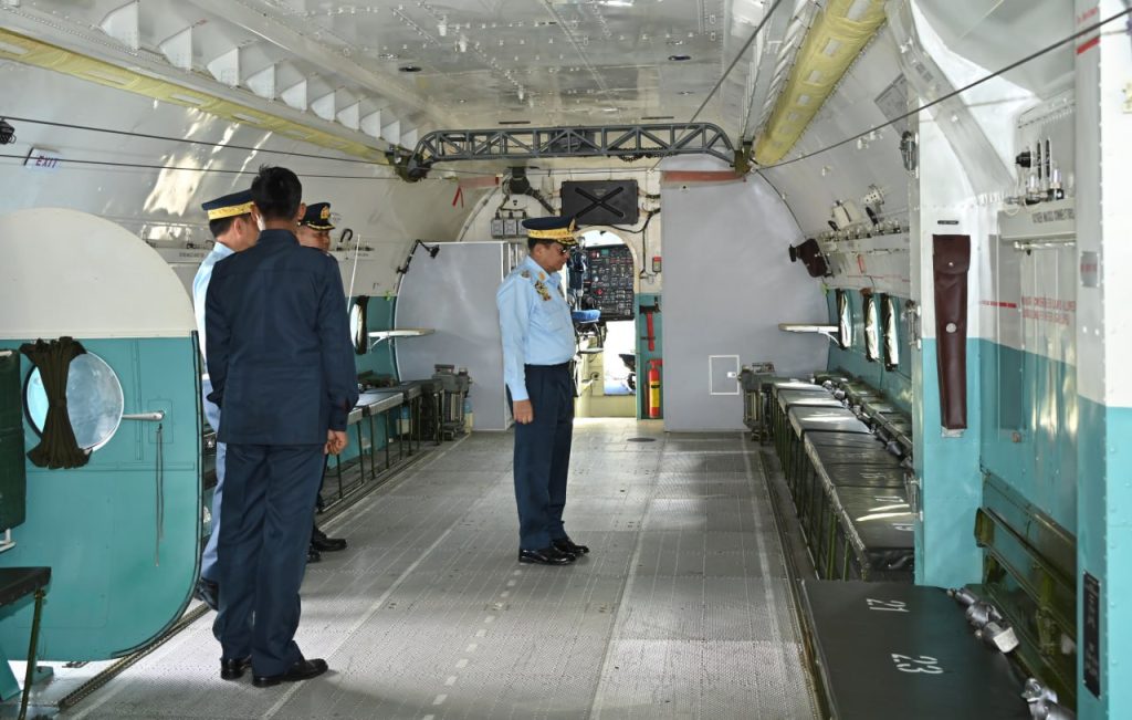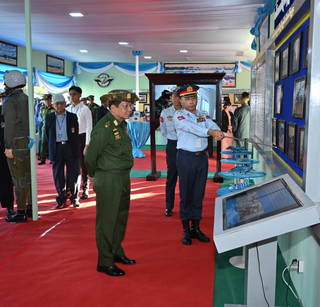In the evening of 14 March, the Senior General and party observed the exhibition commemorating the 77th Anniversary of the air force and the commissioning ceremony. The exhibition displayed the history of the air force, uniforms used by the air force in successive eras, photographs depicting the history of the air force, documentary photographs of commanders-in-chief of the air force, historic aircraft and battles they fought, avionics equipment used in aircraft, miniatures of new generation aircraft and equipment used by pilots, weapons and ammunition used by the air force, photographs of air force personnel who won medals for the their capabilities, photographs of commissioning ceremonies of aircraft, documentary photographs of training for officers, other ranks and substitutes of air force, photographs depicting the international relations and development of the air force, photographs of prize presentation ceremonies for pilots by commanders-in-chief and aviation electronic equipment produced by the air force.