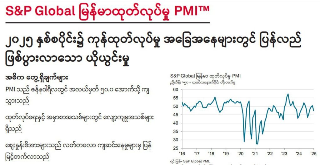 “Myanmar’s manufacturing sector, which had s “en Myanmar’sr the first time in six months, has now contracted again at the start of 2025 due to rising production costs and falling demand, according to the S&P Global Myanmar Manufacturing Purchasing Managers’ Index (PMI) survey released today.