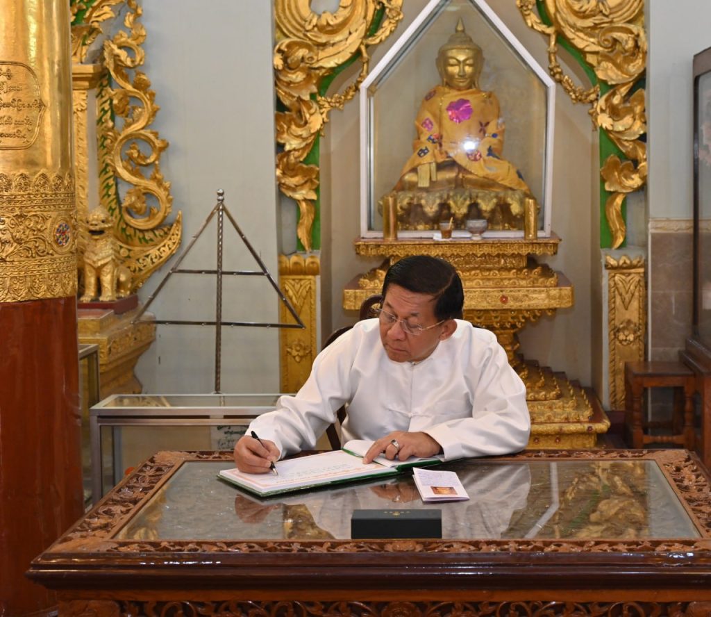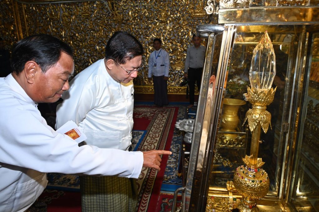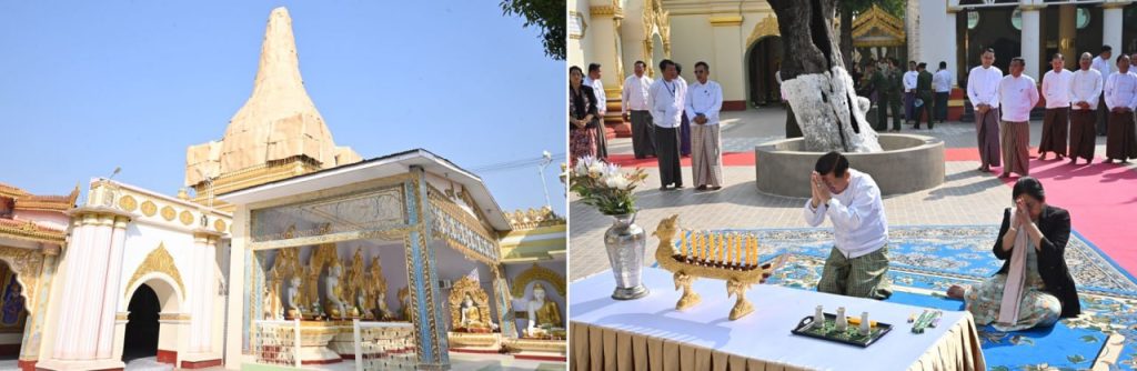 At Shwekyeemyin Pagoda, the Senior General, wife and party paid homage to Buddha images from all over the country including Anyathihataw Buddha Image, Shwekonoak Buddha Image, Myatheindan Buddha Image, Shwelinpin Buddha Image, and Shwekyeemyin Buddha Image that were revered by the successive ancient dynasties and that were placed in the cave of the pagoda. They offered flowers and water to the Images.