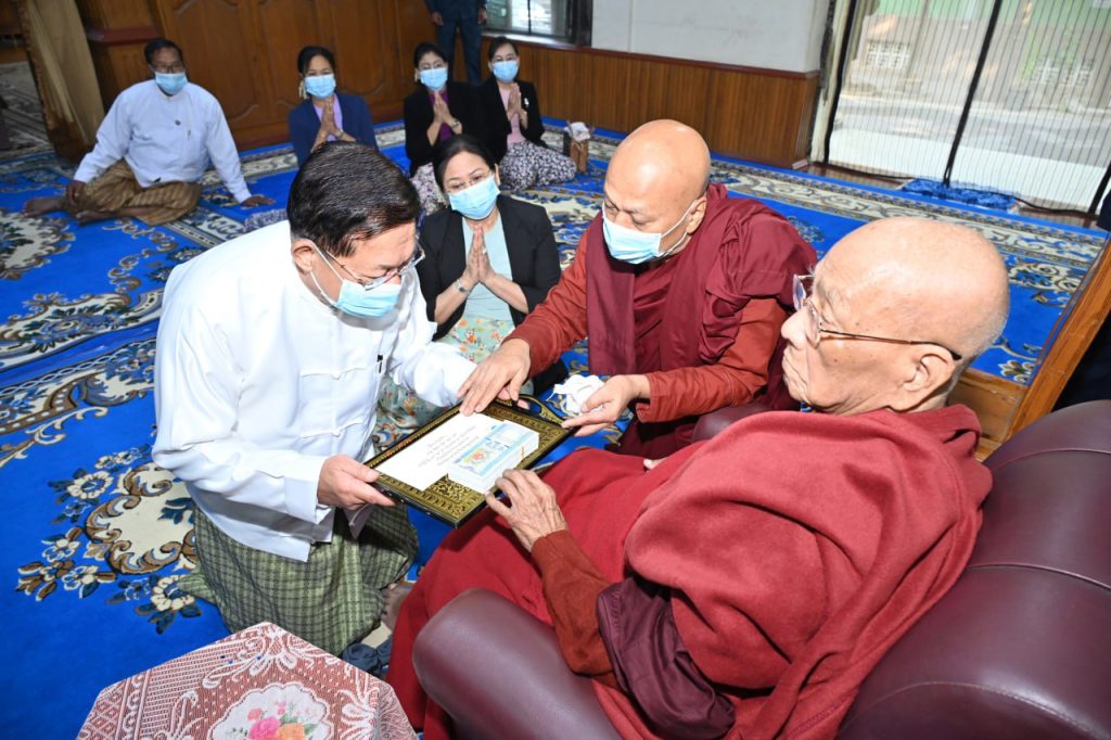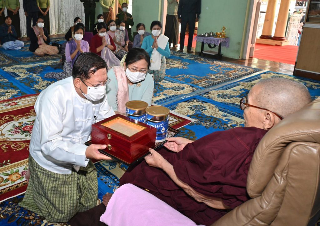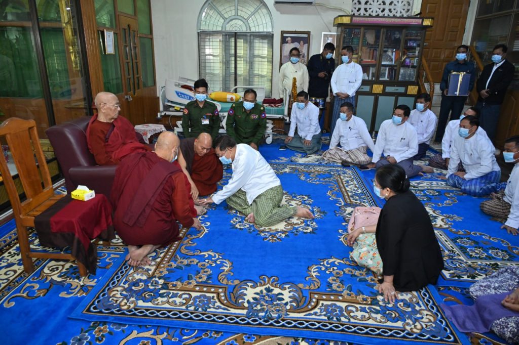 Chief Patron of Maha Wizitayon Pariyatti School, Chanayethazan Township, Mandalay Region, State Ovadacariya Sayadaw Abhidhija Maha Rattha Guru Abhidhija Maha Saddhamma Jotika BhaddantaVicarindabhivamsa (age 97, vasa 77) was receiving medical treatment at the Military Hospital in Pyin OoLwin. As the Sayadaw has recovered from illness, he is now staying at Maha Wizitayon Pariyatti School. Chairman of State Administration Council Prime Minister Senior General Min Aung Hlaing, accompanied by wife Daw Kyu Kyu Hla and the entourage, paid respects to the Sayadaw this morning.